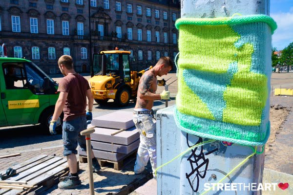 Blødt, farverigt strik bliver i denne kontekst både en modsætning til de hårdtarbejdende brolæggere og det til tider hårde, kyniske politiske miljø på Christiansborg, som man aner i baggrunden af billedet. Og kigger man efter skjuler der sig yderligere et budskab i strikmotivet. Foto: Søs Uldall-Ekmann/STREETHEART